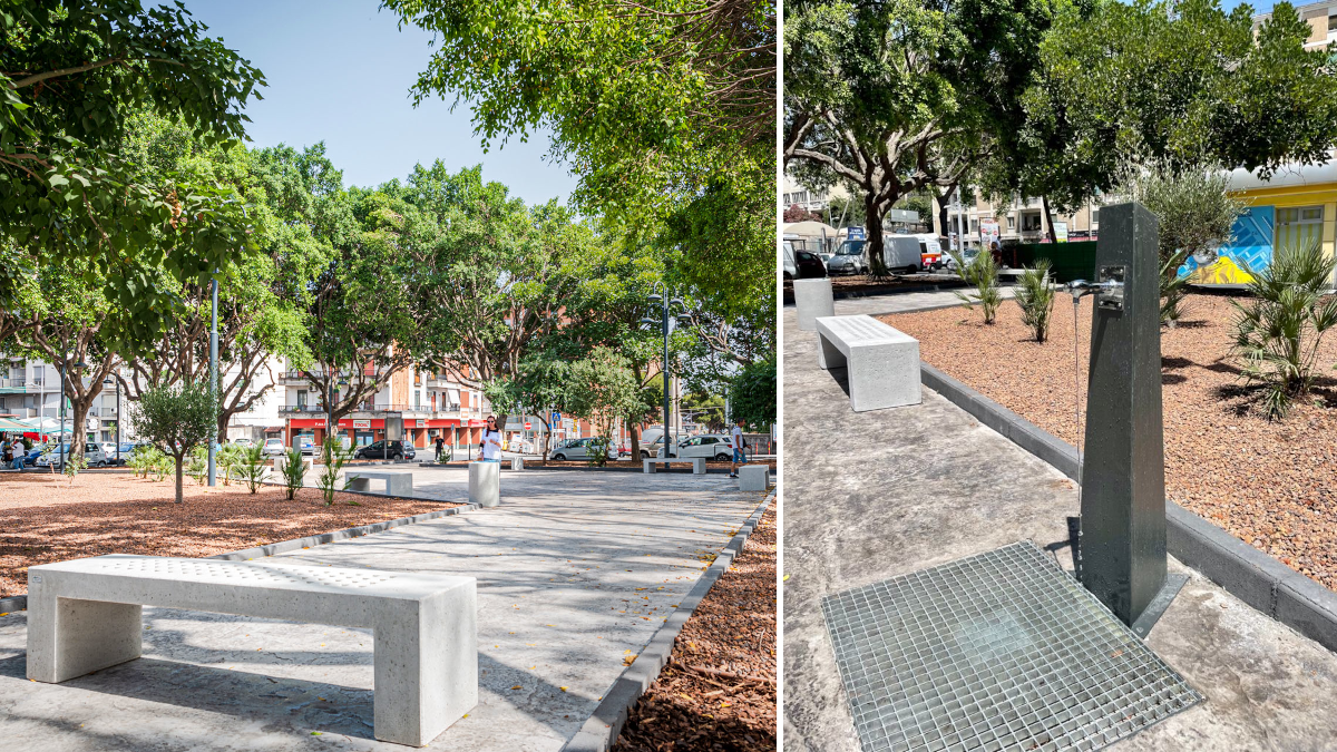 Il restyling di piazza Risorgimento comprende: nuove piante tipiche della macchia mediterranea, riconfigurazione dello spazio pedonale con nuova pavimentazione ed accessi per portatori di handicap, nuove panchine monoblocco, cestini portarifiuti, rastrelliera porta bici e fontanella in acciaio zincato con il controllo temporizzato dell’acqua potabile.