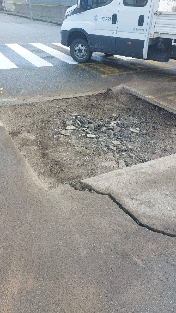 Il comitato dei genitori aveva segnalato la fessura: interventi iniziati il 2 aprile 2026 per ripristinare asfalto e mettere in sicurezza l'area.